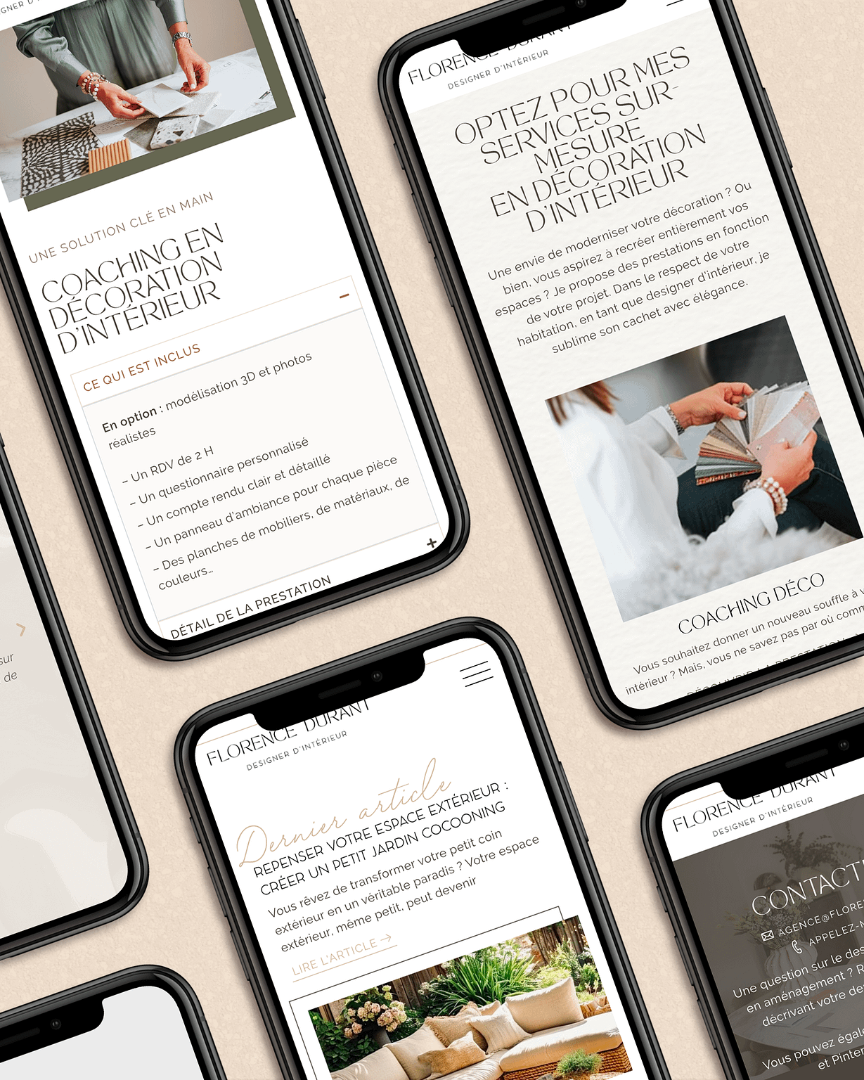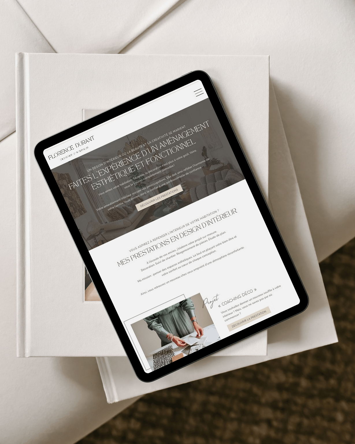 Florence crée des intérieurs harmonieux et personnalisés pour ses clients. Notre duo créatif a été choisi pour donner vie à sa présence digitale. Suite à la création de son identité visuelle par Anaïs de Tadam Studio, j’ai développé une plateforme web qui prolonge son univers. Le site met en valeur sa philosophie et son approche unique du design d’intérieur.