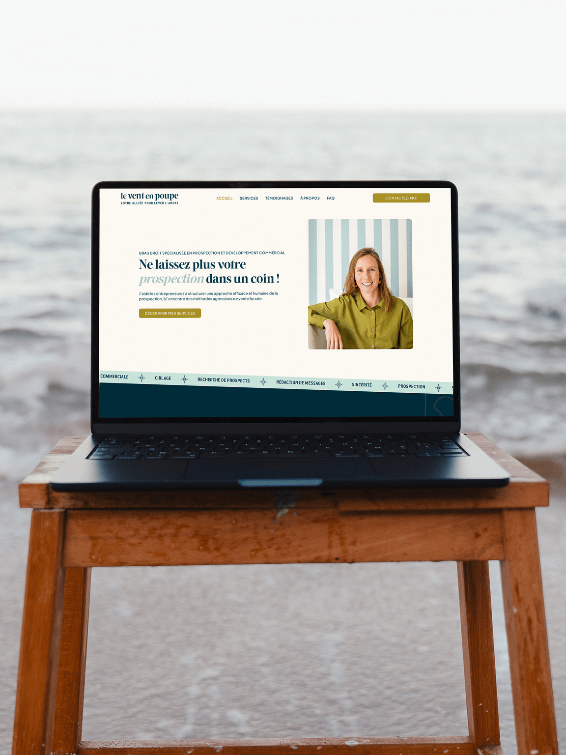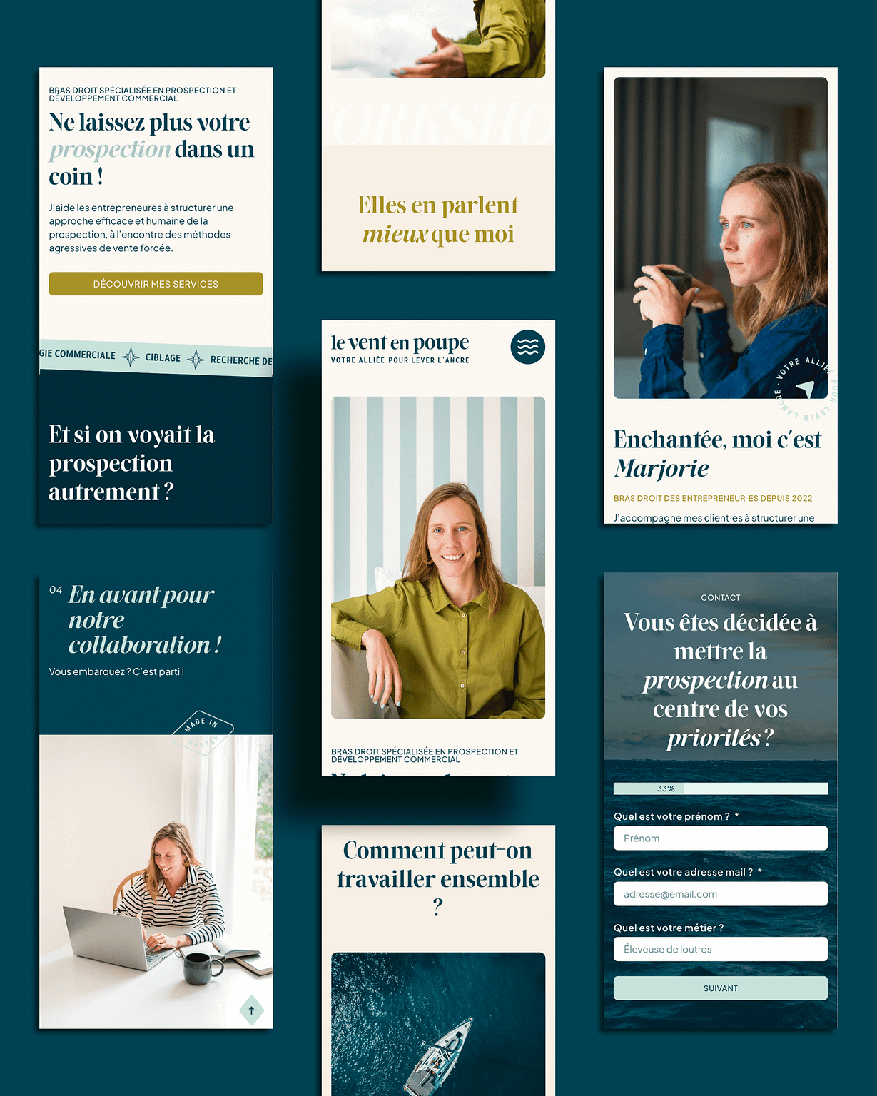 Marjorie est bras droit spécialisée en prospection et développement commercial. Elle aide les entrepreneures à structurer une approche efficace et humaine, loin des méthodes agressives. Pour soutenir son activité, elle avait besoin d’un site simple mais impactant : une vitrine claire, professionnelle et alignée avec son univers marin créé par Lise de Studio La Juria. Nous avons donc conçu un site one page, suffisant pour présenter son positionnement, ses offres et inspirer confiance dès la première visite.